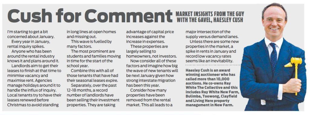 Landlords aim to get their leases to finish at that time to minimise vacancy and maximise rent. Agencies manage holidays around it to handle the influx of inquiry. Local tenants try to have their leases renewed before Christmas to avoid standing in long lines at open homes and missing out.