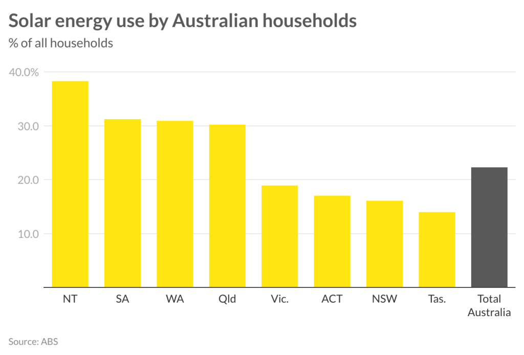 The Survey of Income and Housing is conducted by the Australian Bureau of Statistics (ABS) every 12 years and provides an in depth look at how people live. As part of the most recent study, where households source their energy by demographic characteristics was provided. Not surprisingly, solar energy is most popular in sunnier climates. But it is also dependent on how generous various state governments are with incentives to switch to solar. Tasmania, which has the lowest proportion of homes on solar energy does not have weather on its side when it comes to solar but also offers limited solar rebates. Western Australia also offers limited solar rebates but does have the weather to support solar energy.